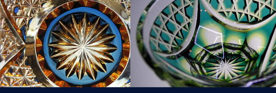 【ぼかし】薩摩切子は透明なガラスに色ガラスを2~5mm位に厚く被せ、これにカット(切子)をすることにより、その境を曖昧にしてぼかし(Gradation)をだした被せカットグラスです。
